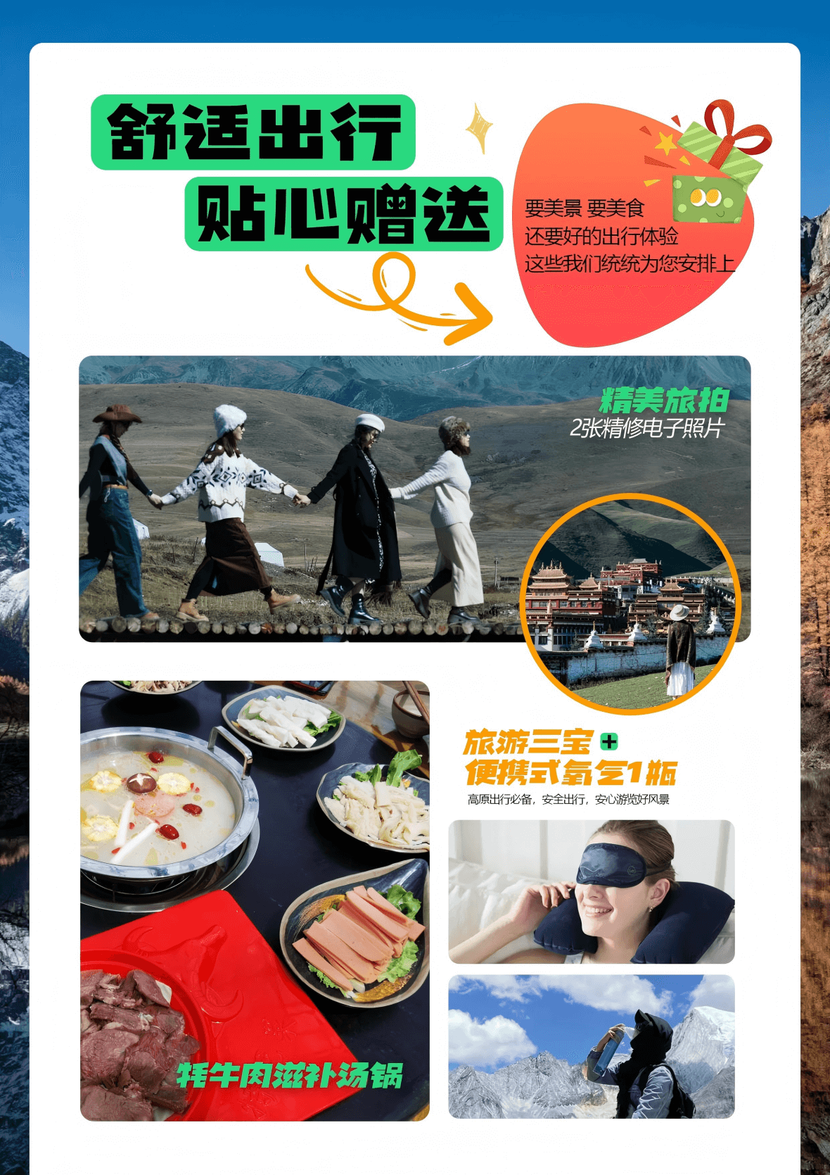 2、【超值贈送】贈送精美旅拍,贈送耗牛肉滋補湯鍋,贈送旅游三寶+便攜式氧氣1瓶;