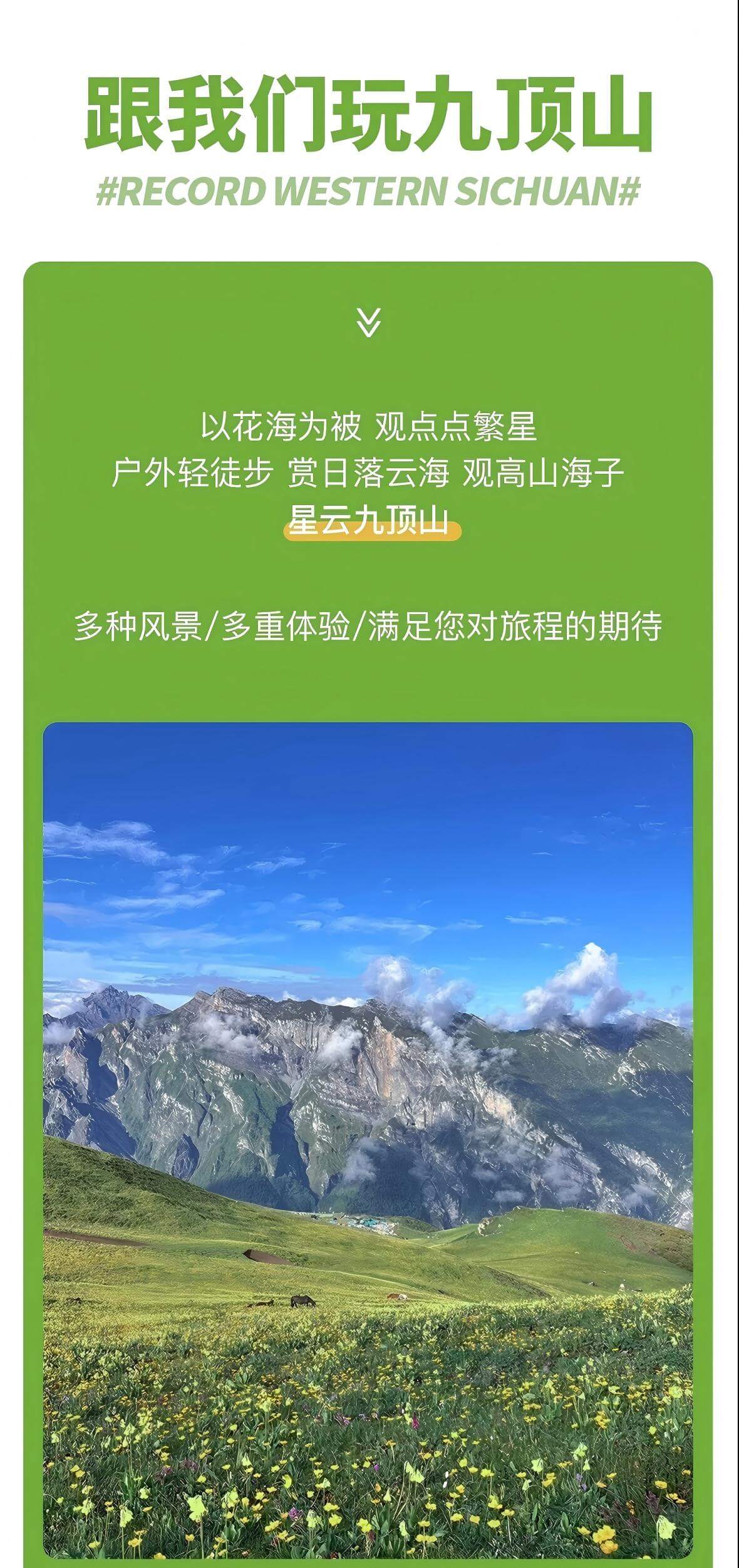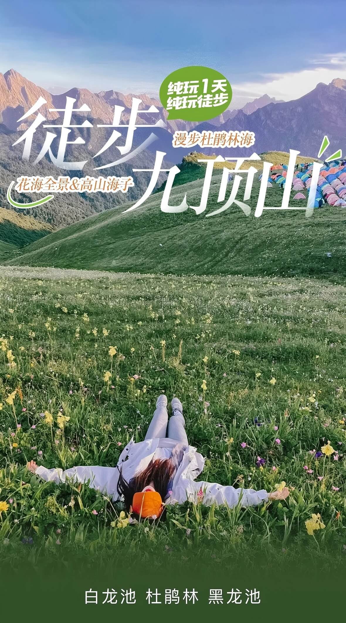 位于阿壩茂縣南新鎮與德陽什邡市紅白鎮之間,隸屬于龍門山脈中部,距成都市中心180KM。九頂山因為九座頂峰相連而得名,最高峰名叫獅子王峰,海拔4989米。九頂山是戶外登山徒步愛好者的天堂,也是攝影愛好者的理想地,將草地、雪山、云海、原始森林、高原湖泊、佛光等自然景觀融合在一起,吸引無數的戶外愛好者前來。這里擁有珙桐、銀杏等300多種動物和3000多種植物,可謂地史奇觀的自然博物館,不僅具有極強的旅游觀光價值,而且還有極高的科學審美價值。