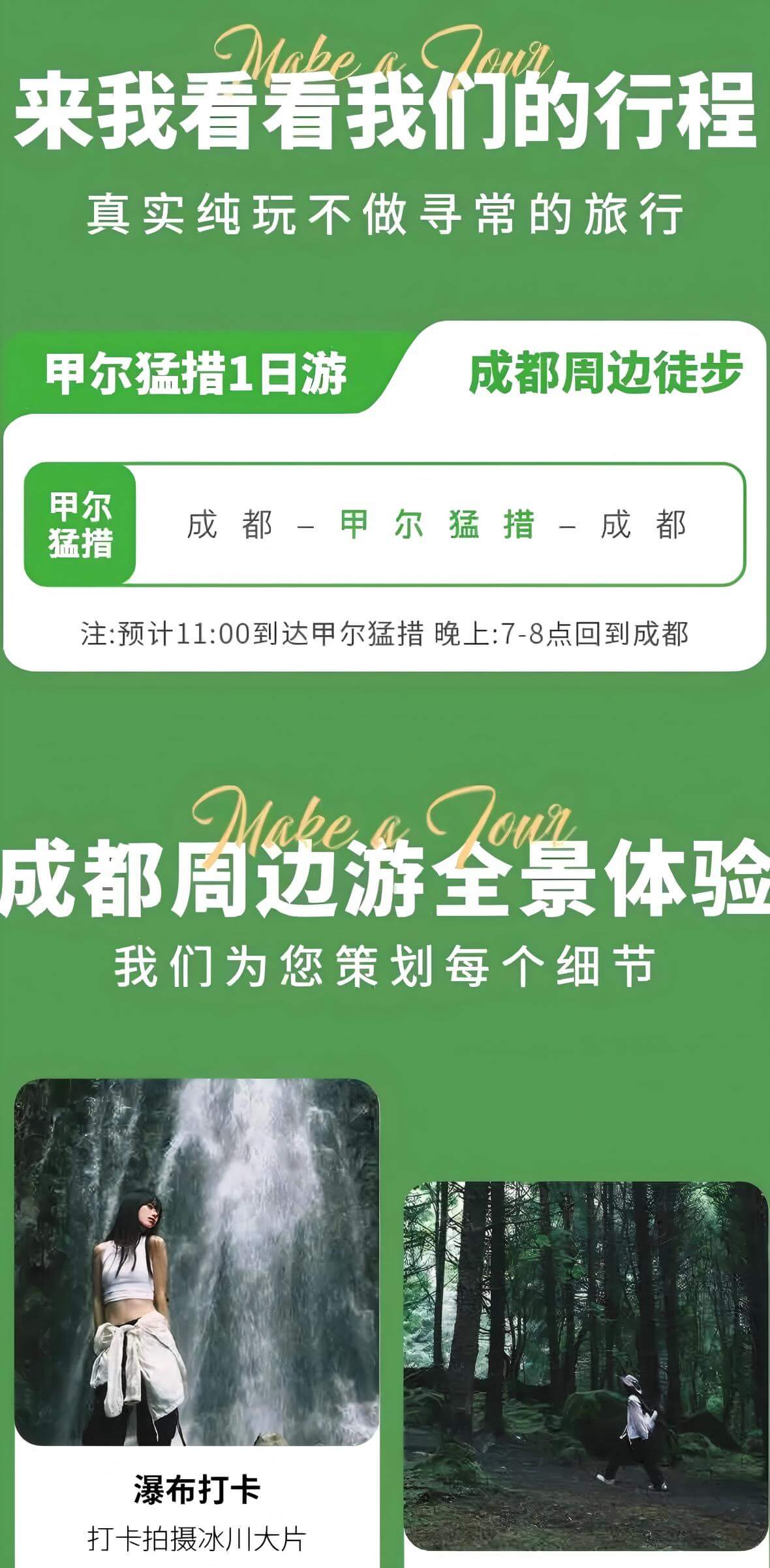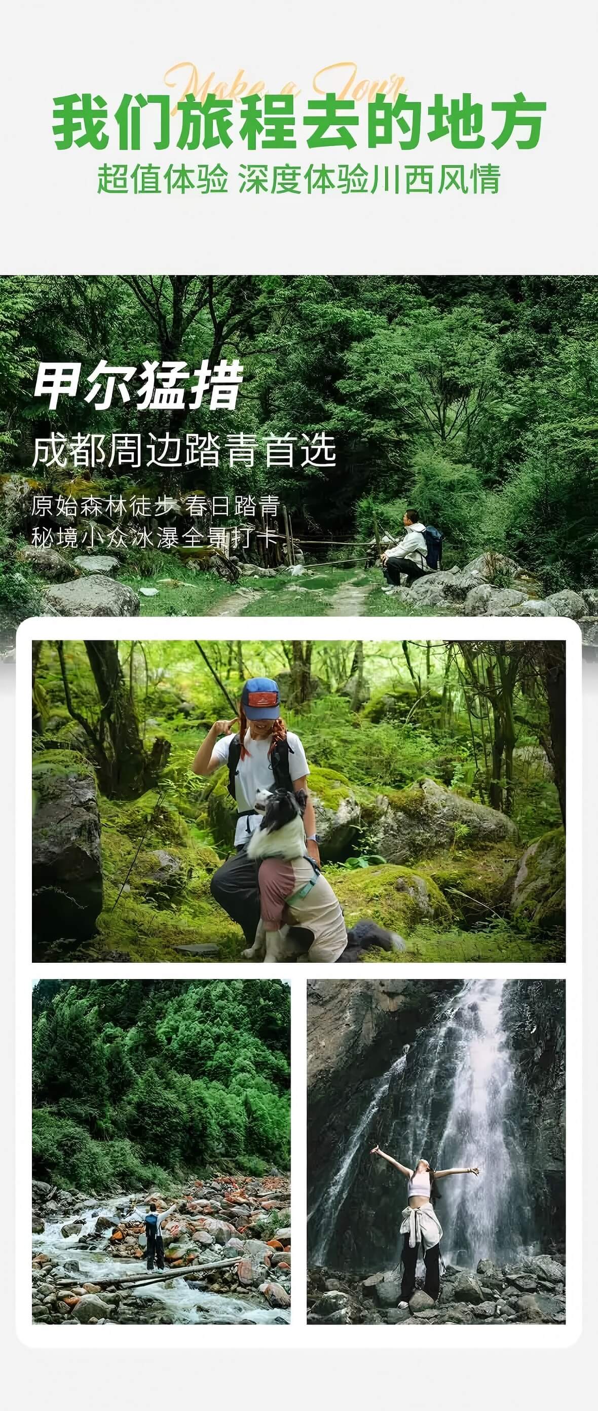 大約11:00左右到達,然后開始徒步。到達營地用餐享受鐵板燒烤(自費48/人需提前預定,自愿消費),不用餐的徒步觀甲爾冰瀑,原始森林,或徒步前往甲爾冰瀑,原始森林,此時處處風景如畫,雪山連綿,樹木繁多,野生動物匯聚,林海浩瀚,空氣清新,風光宜人,領隊帶領大家合影留念,擺美美的姿勢,拍大片 。這里夏天可避暑采野生菌,秋賞彩林,冬玩雪。游玩之后徒步返回大巴車位置;