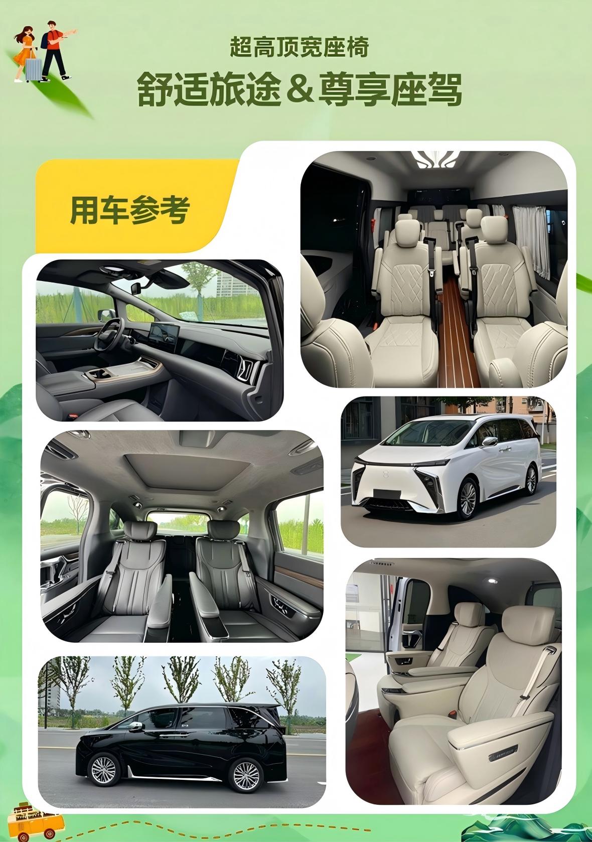 1、交通:1-3人用5座SUV;4-5人用7座商務車;6人9座商務車;