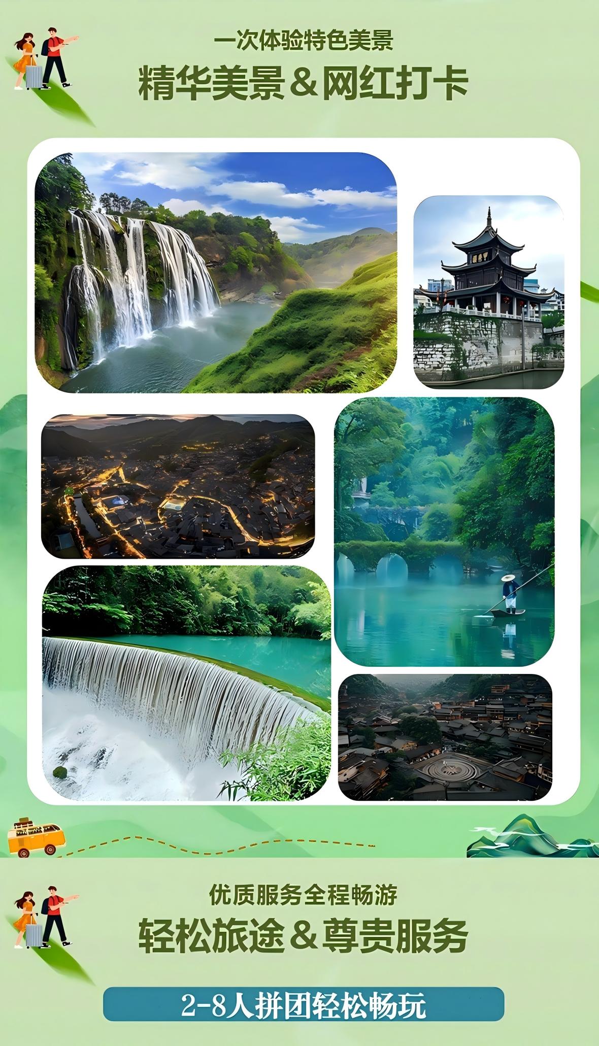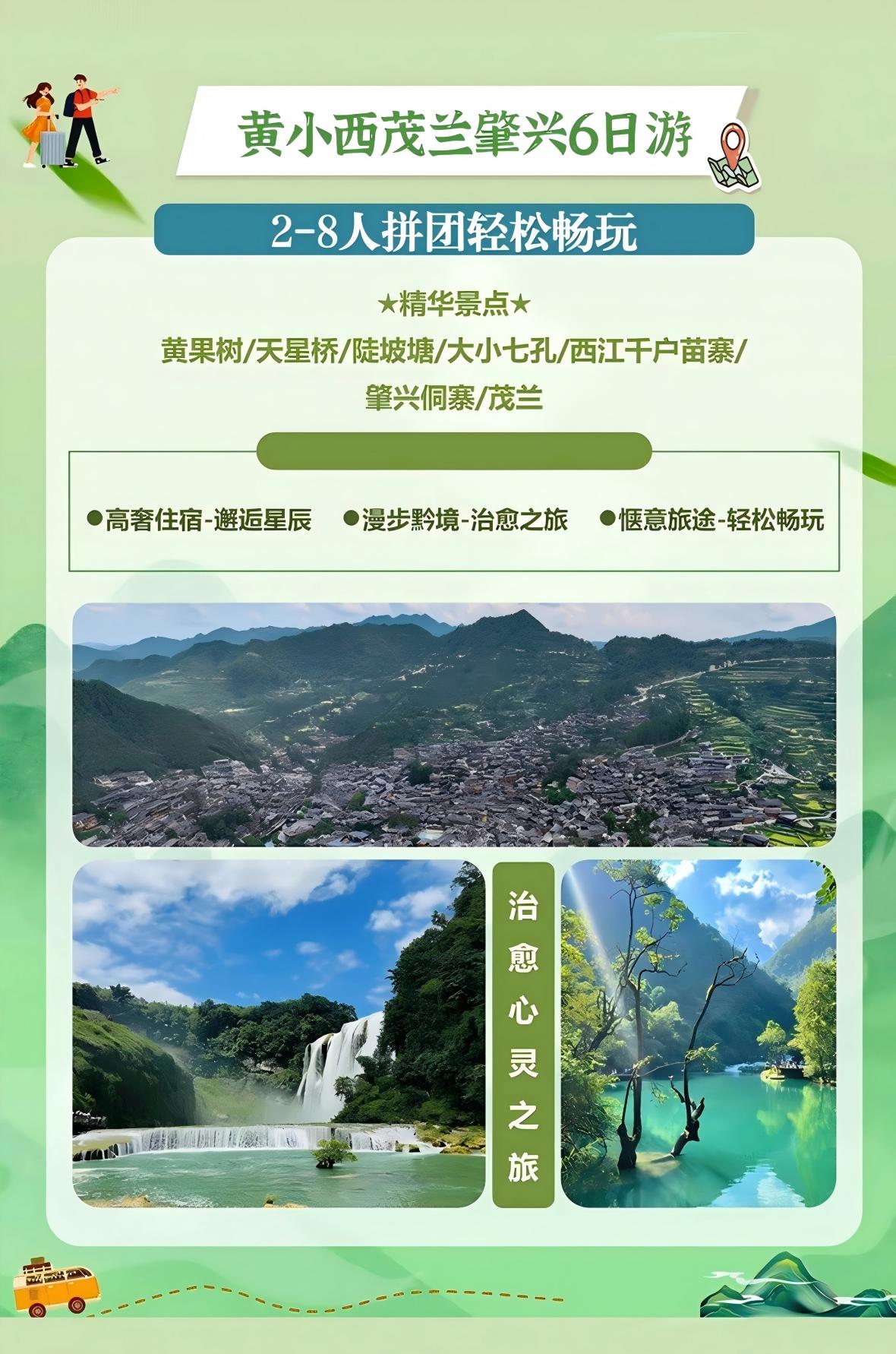 【精華景點】黃果樹/天星橋/陡坡塘/大小七孔/西江千戶苗寨/肇興桐寨/茂蘭;【輕松旅途】2—8人拼團輕松暢玩;