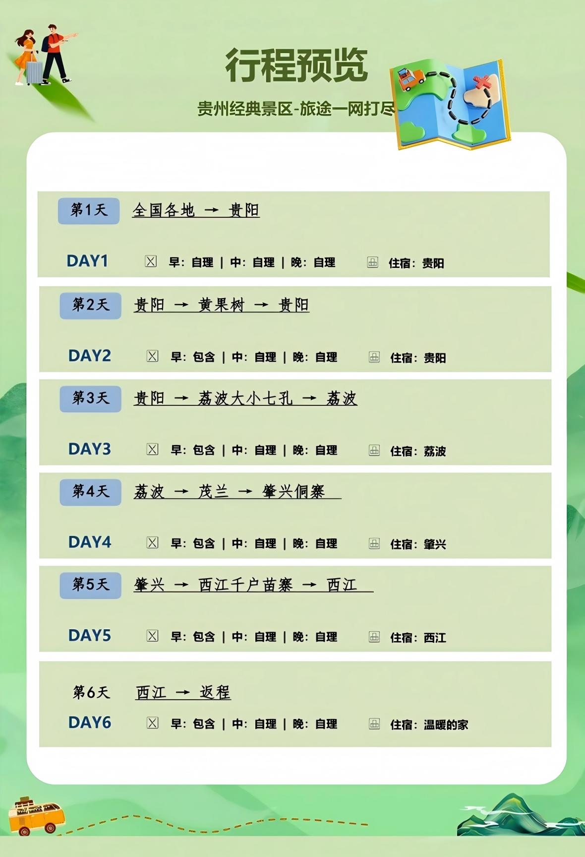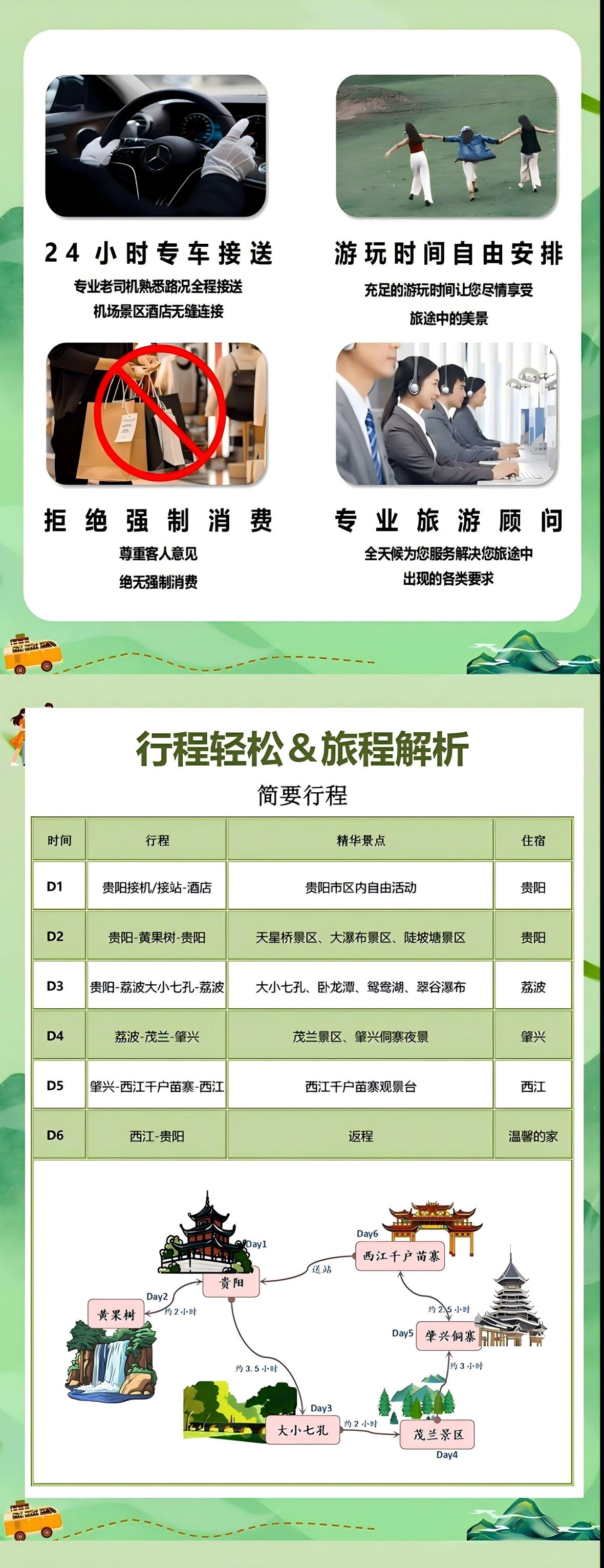 必消自費:黃果樹觀光車50元+景區保險10元=60元/人小七孔觀光車40元+景區保險10元=50元/人西江千戶苗寨電瓶車20元+景區保險10元=30元/人肇興侗寨觀光車20元茂蘭景區觀光車45元(可選)