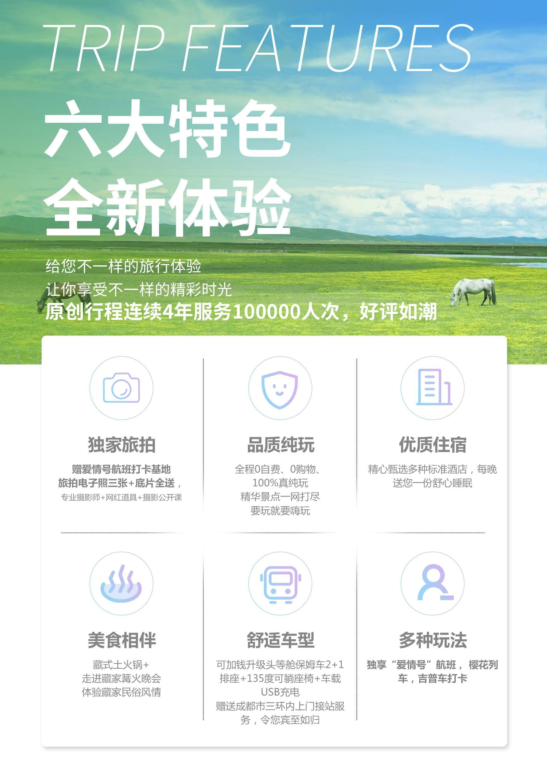 14:00—15:30 參加草原游牧體驗,自由游覽,體驗騎馬射箭放風箏(行程包含項目,不參加不退費),獨享愛情號航班、櫻花列車、吉普車旅拍送精修電子照 3 張+底片全送)?