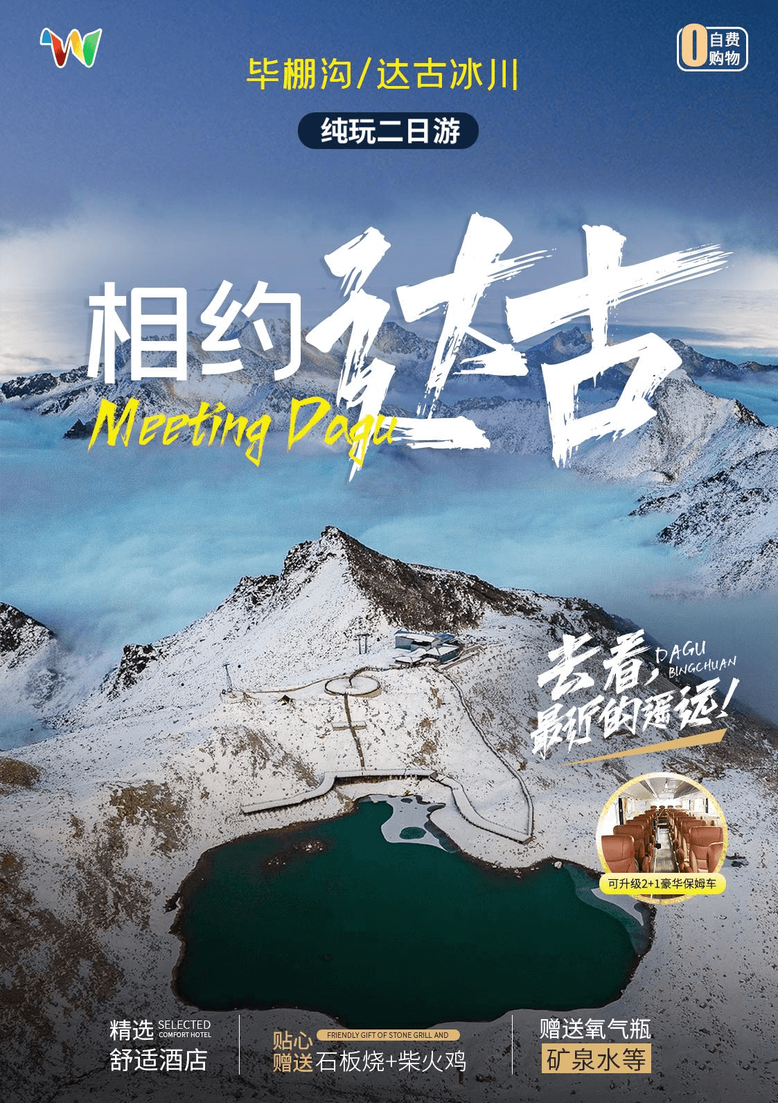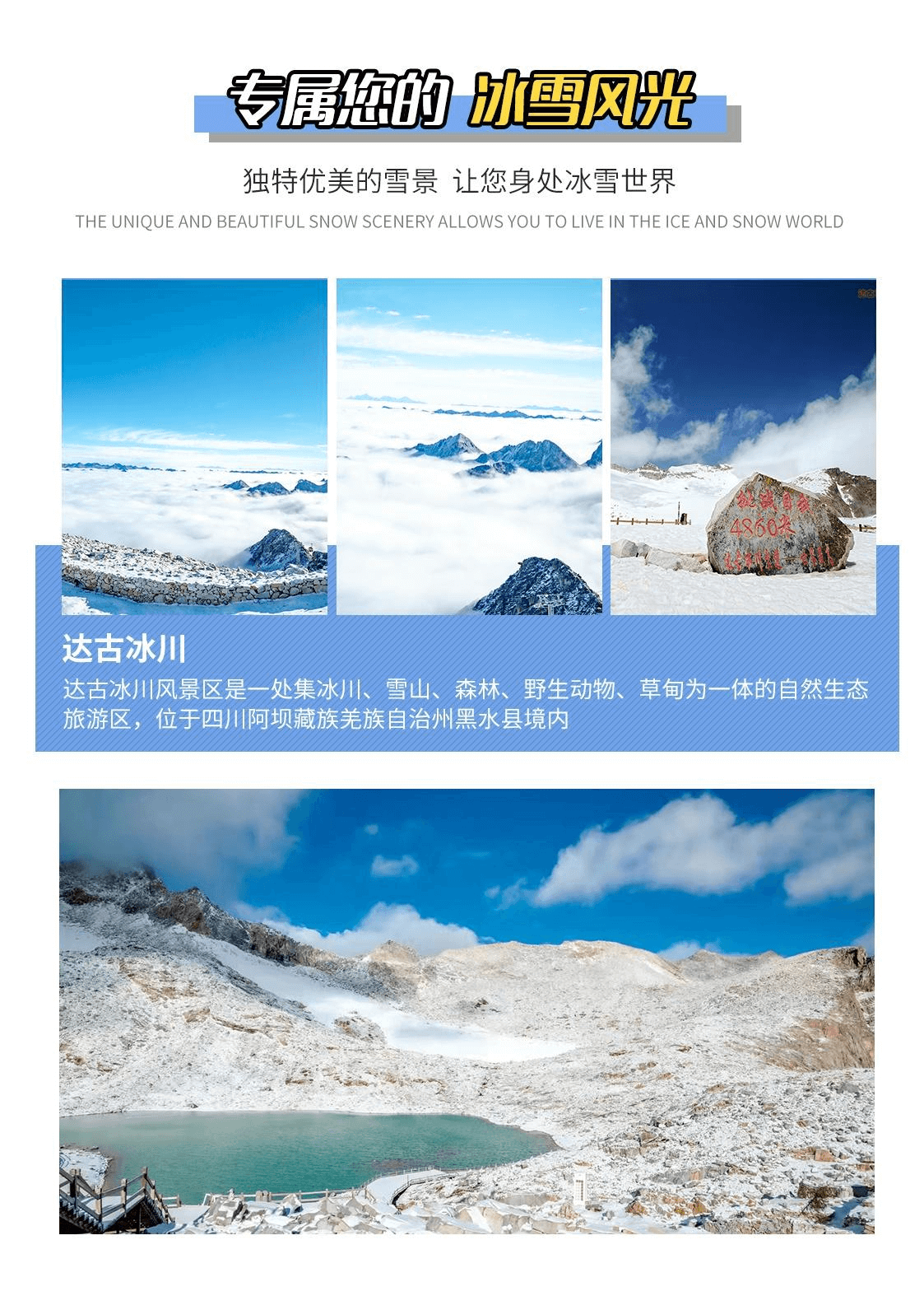 09:30—15:00 游覽達古冰川(觀光車自理 70 元/人,游覽該景區,觀光車必坐)沿途可游覽【金猴湖】后進入藏民風情體驗區,游覽【上、中、下達古藏寨】【放生湖】,進入高山牧場休閑區可游覽【達古湖】,到達索道下站客人可選擇自費乘坐景區便民設施,全球第一高海拔觀光索道(索道自費 180 元/人,如需到達達古冰川山頂,觀冰川全景,需乘坐該索道才能前往)坐索道到達海拔 4860 米的冰川腹地,融入空曠寂靈的冰天雪地,觀賞一號冰川,感受一覽眾山小,俯視一切的雄壯氣概,或者徒步游覽【凌云瀑布】【紅石坡】等景點?