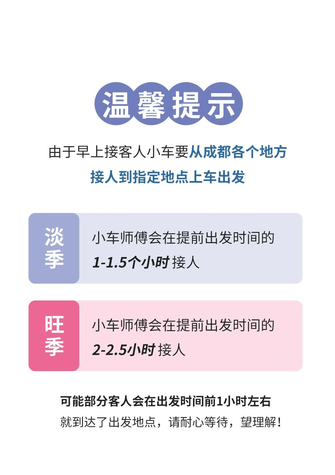 注:此行程免費贈送成都市三環內包接服務,接人師傅會在出團前一天晚 6 點—9 點與您聯系,請保持通訊暢通,注意接聽電話。疫情 期間注意防護,如有身體不適第一時間告知工作人員