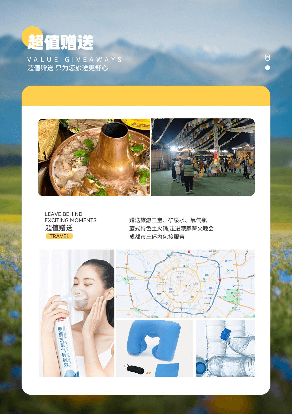 (1)旅游系長距離、長時間活動,途中乘坐各種交通的時間較長,加之食宿條件不同于平常習慣,可能會比較辛苦,四川甘孜州、阿壩州等高原地區海撥高有可能有高原反應的,請權衡自己的健康狀況是否適應本次旅行。