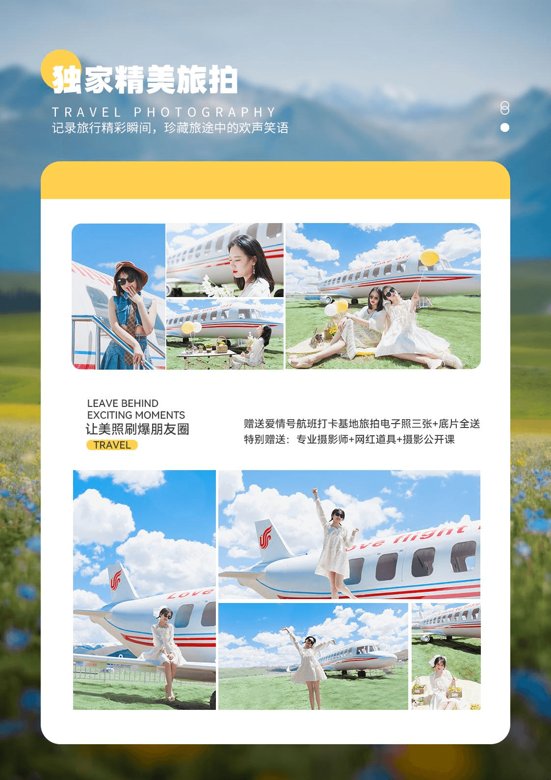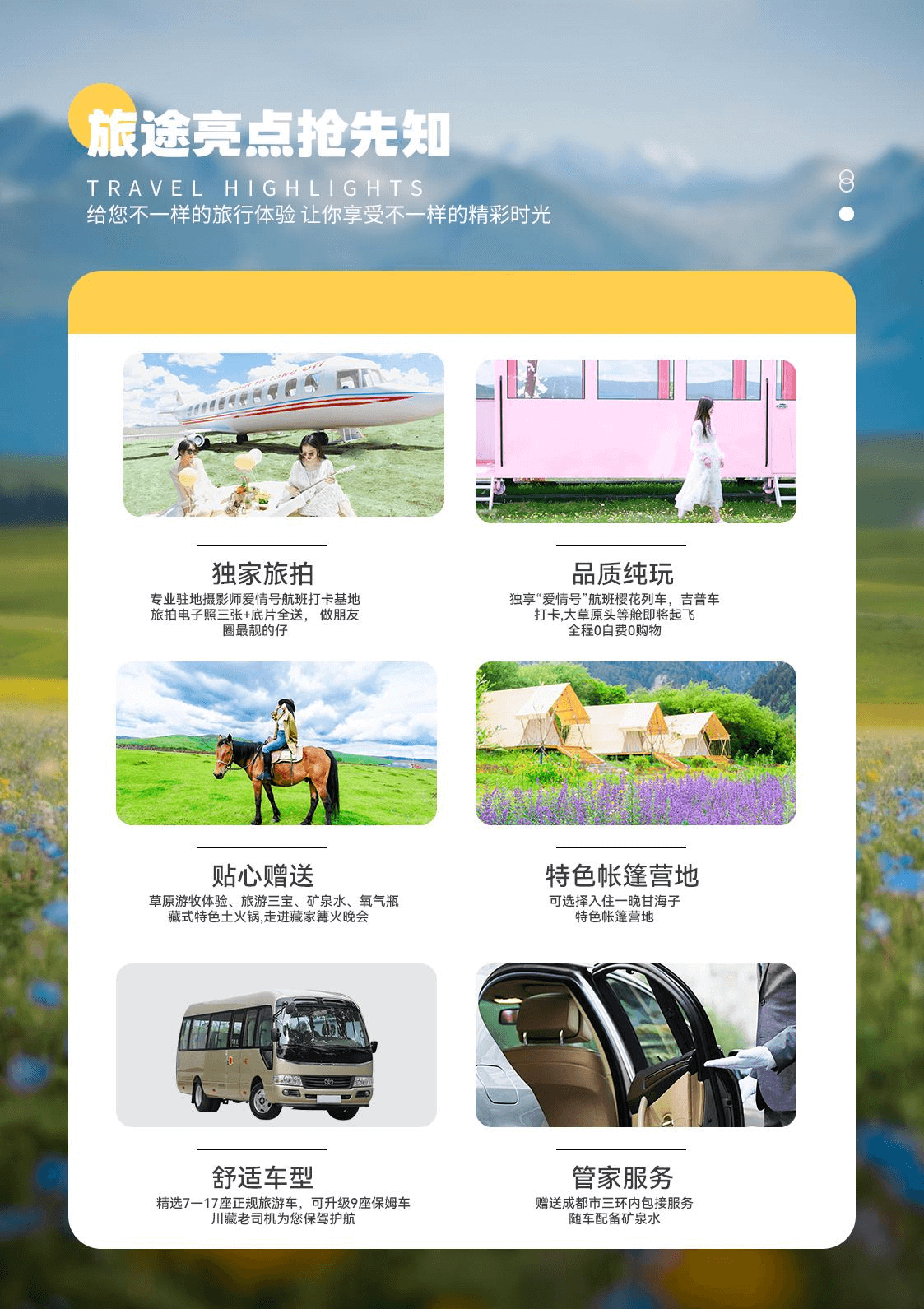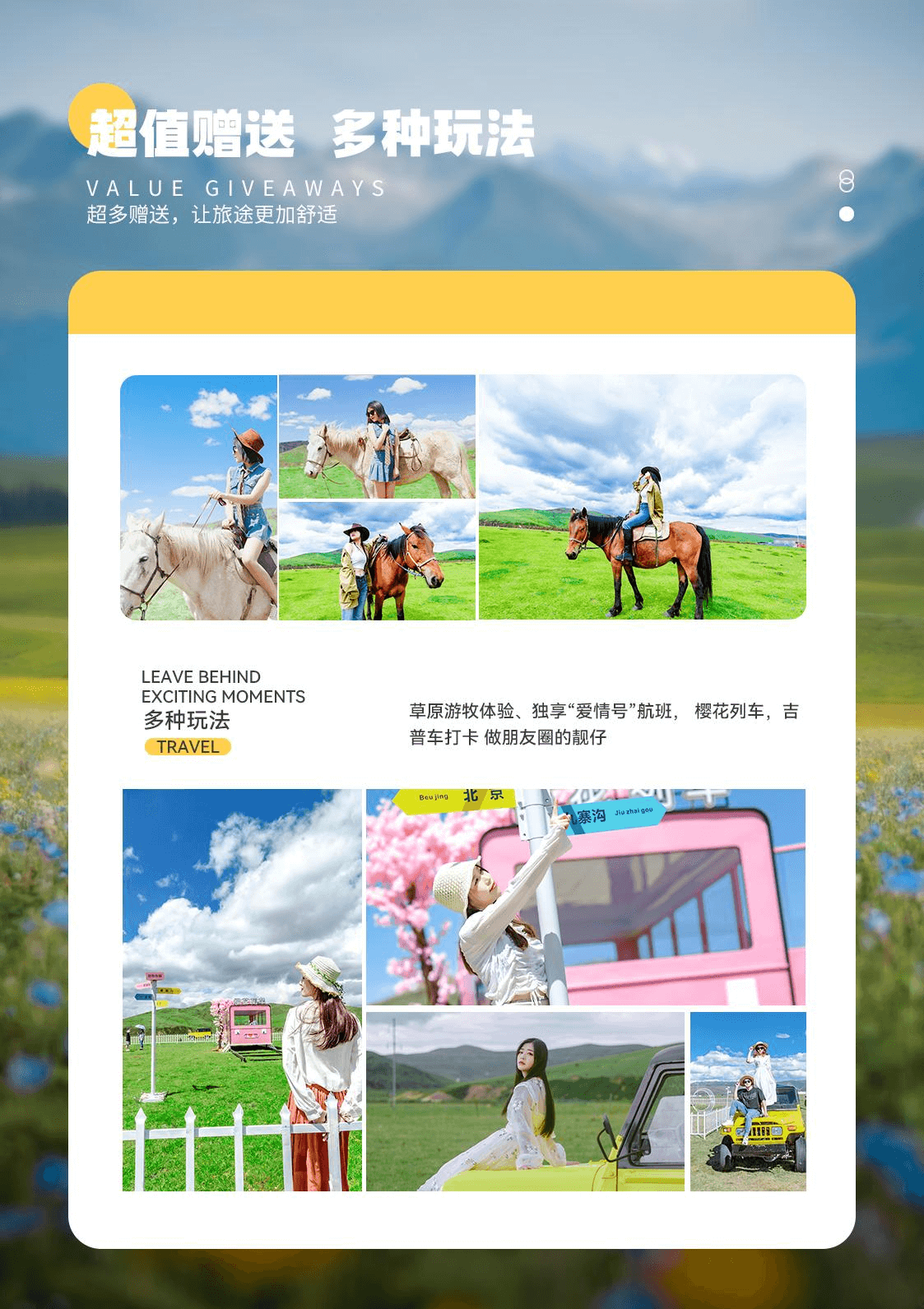 14:00—16:00 參加草原游牧體驗,自由游覽,體驗騎馬射箭放風箏(行程包含項目,不參加不退費),獨享愛情號航班、櫻花列車、吉普車旅拍送精修電子照 3 張+底片全送)?
