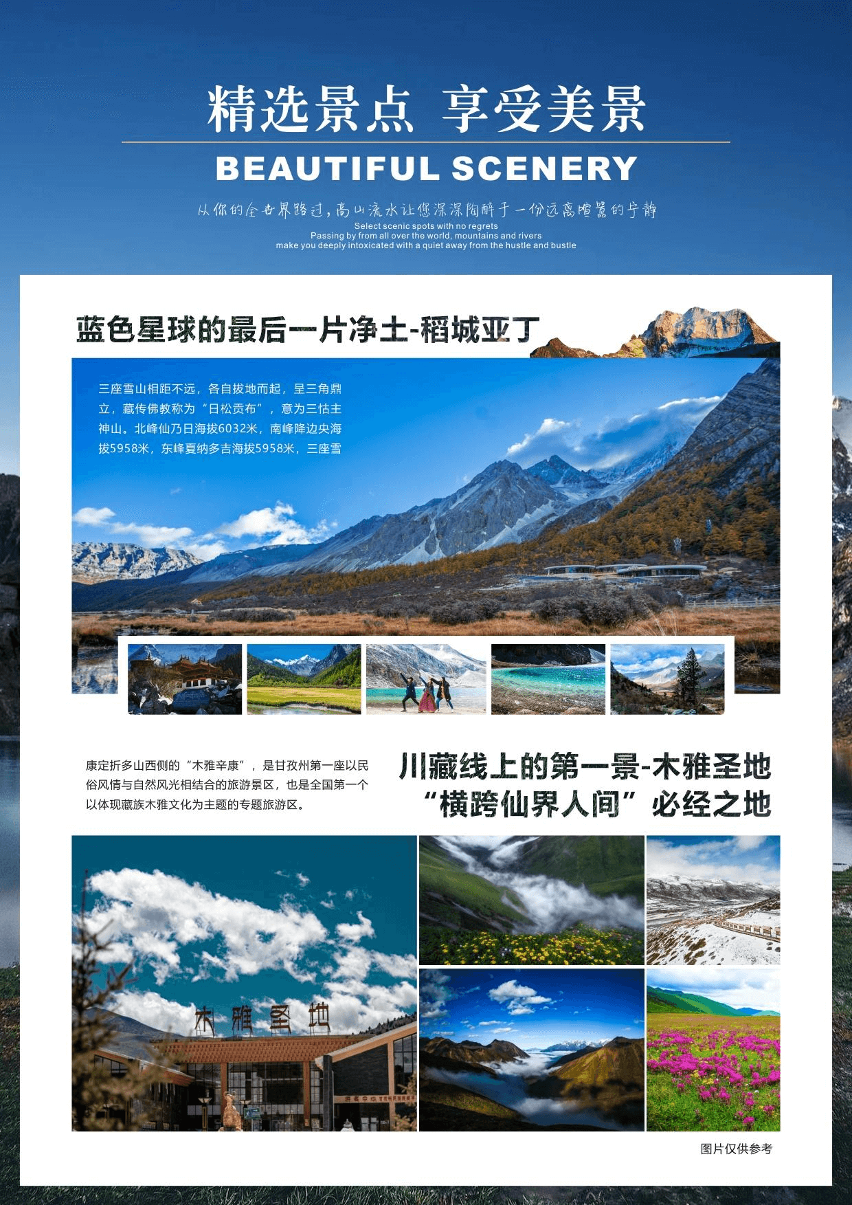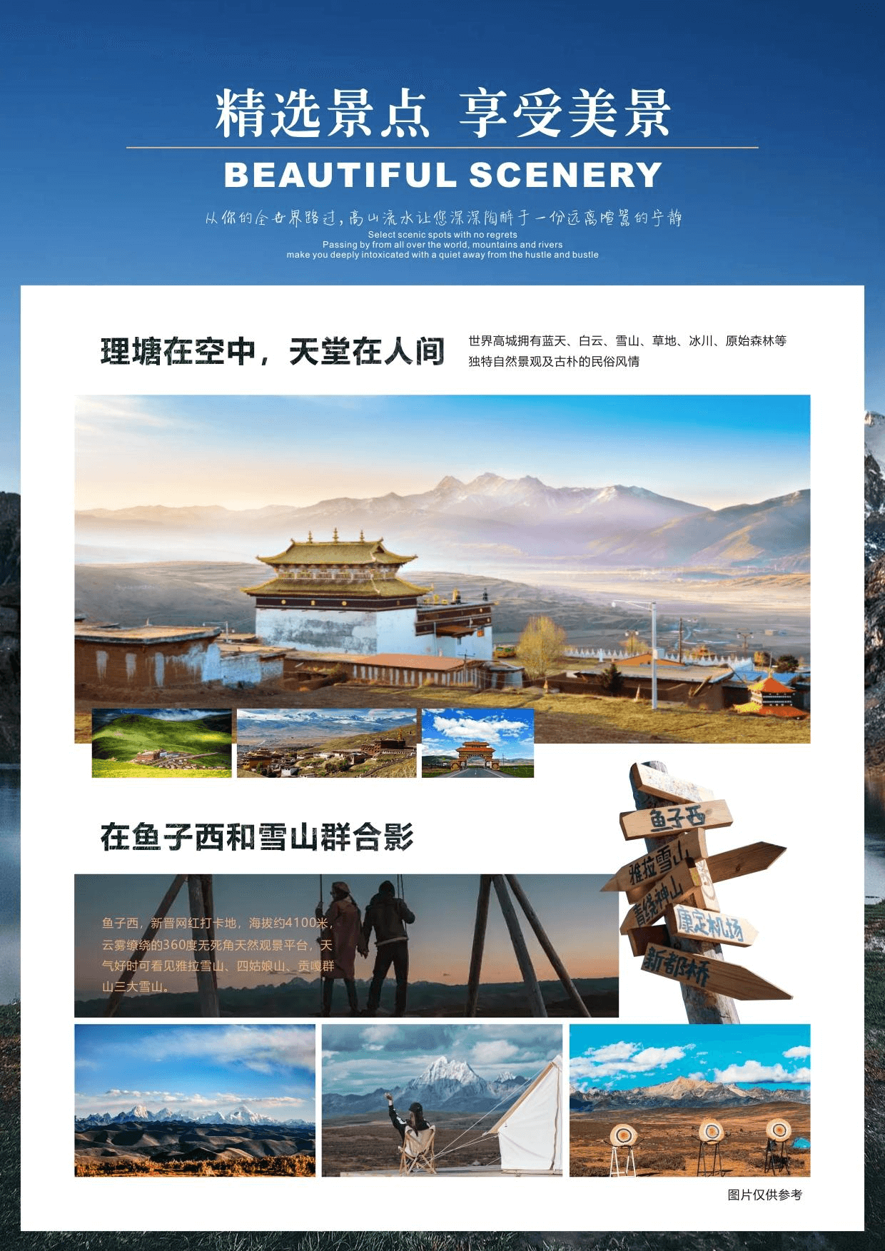 中午:抵高原明珠世界高城和丁真家鄉【理塘】海拔 4014 米,遠觀【毛埡大草原】風光后,贈送參觀【勒通古鎮】(此景點為贈送景點,如因天氣、堵車、交通管制等特殊原因不能前往,費用不退,且不做等價置換)我們將轉乘景區的電瓶觀光車(觀光車費用:35 元/人自理)景區位于理塘縣城北老城區,目前已成功申辦為國家 AAAA 級景區。景區內有第六世倉央嘉措寫下“潔白的仙鶴,請把雙翅借給我,不飛遙遠的地方,轉一轉理塘就飛回”,預示著七世達賴將降生于理塘,后前往藏區最大黃教寺廟-長青春科爾寺,長 青春科爾寺又稱理塘寺,于 1580 年由第三世達賴喇嘛索南嘉措創建,是康區歷史最悠久,規模最大的藏傳佛教黃教寺廟。之后前往繼續翻越形似兔子的【兔子山】、經青藏高原最大的古冰體遺跡,即“稻城古冰 帽” 平均海拔 4500 米左右【海子山自然保護區】,后經稻城白塔又叫尊勝塔林,是稻城的門戶, 由一個主塔和 108 個小塔組成,每天也都有人來轉經。尊勝塔林的 108 個小塔內放置的是釋迦牟尼佛祖,主塔內放置的是尊勝佛母。尊勝佛母,音:“朗覺瑪”,乃長壽三尊之一,主長壽。后途經前往桑堆雪域高原服 務中心(高原旅游知識宣傳點),時間 20-30 分鐘,了解高原預防知識,高原服務中心有兜售防寒衣物,氧氣或抗高反藥物,有工作人員上車講解,如有需要謹慎購買。此行為與旅行社無關! 敬請知悉!至【稻城】(名稻壩,意為山谷溝口開闊之地)。?