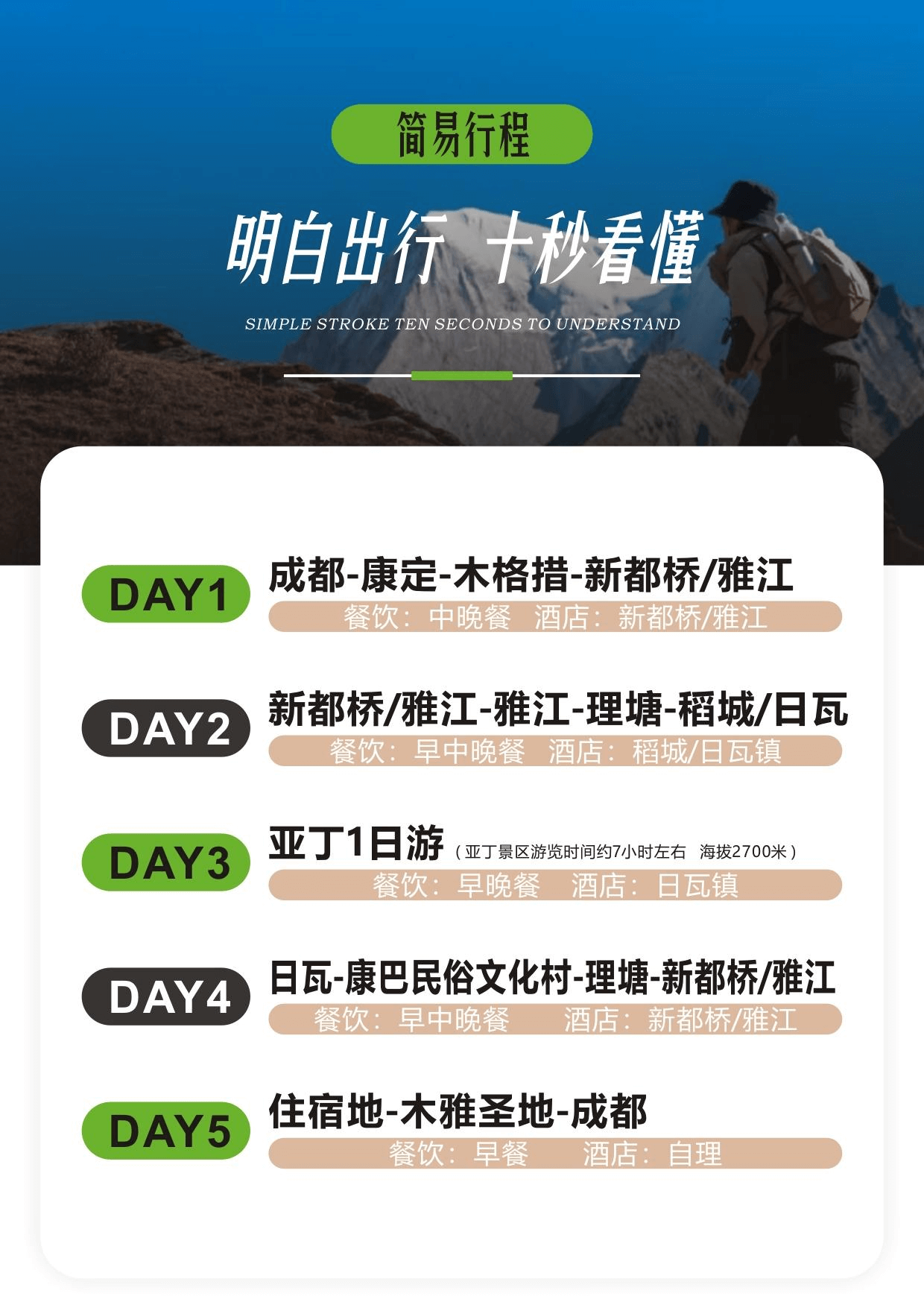 住宿:D1 晚:新都橋/雅江;D2 晚:稻城/日瓦鎮;D3 晚:日瓦鎮 ;D4 晚:新都橋/雅江。