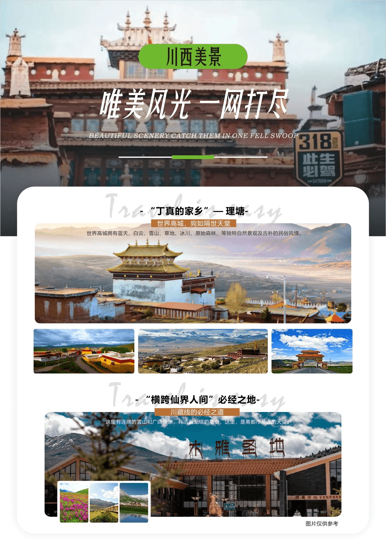 中午:抵高原明珠世界高城和丁真家鄉【理塘】海拔 4014 米,抵達理塘營地【贈送特色美食-高原鱈魚火鍋(贈送項目,如遇特殊情況無法贈送或自愿放棄等,不用不退費且不做置換,贈送為基礎版本,游客可自愿加錢升級 150 元/人的豪華套餐),后車觀【毛埡大草原】風光后,贈送參觀【勒通古鎮和長青春科爾寺】 (此景點為贈送景點,如因天氣、堵車、交通管制等特殊原因不能前往,費用不退,且不做等價置換)我們將轉乘景區的電瓶觀光車,(觀光車費用:35 元/人自理)景區位于理塘縣城北老城區,目前已成功申辦為國 家 AAAA 級景區。景區內有第六世倉央嘉措寫下“潔白的仙鶴,請把雙翅借給我,不飛遙遠的地方,轉一轉理 塘就飛回”,預示著七世達賴將降生于理塘,后前往【藏區最大黃教寺廟-長青春科爾寺】,長青春科爾寺又稱理塘寺,于 1580 年由第三世達賴喇嘛索南嘉措創建,是康區歷史最悠久,規模最大的藏傳佛教黃教寺廟。之后前往繼續翻越形似兔子的【兔子山】、經青藏高原最大的古冰體遺跡,即“稻城古冰帽” 平均海拔 4500 米左右【海子山自然保護區】,后經稻城白塔又叫【尊勝塔林】,是稻城的門戶,由一個主塔和 108 個小塔組成,每天也都有人來轉經。尊勝塔林的 108 個小塔內放置的是釋迦牟尼佛祖,主塔內放置的是尊勝佛母。尊勝佛母,音:“朗覺瑪”,乃長壽三尊之一,主長壽。后途經前往桑堆雪域高原服務中心(高原旅游知識宣傳點),時間 20-30 分鐘,了解高原預防知識,高原服務中心有兜售防寒衣物,氧氣或抗高反藥物,有工作人員上車講解,如有需要謹慎購買。此行為與旅行社無關!敬請知悉!至【稻城】(名稻壩,意為山谷溝口開闊之地)。?
