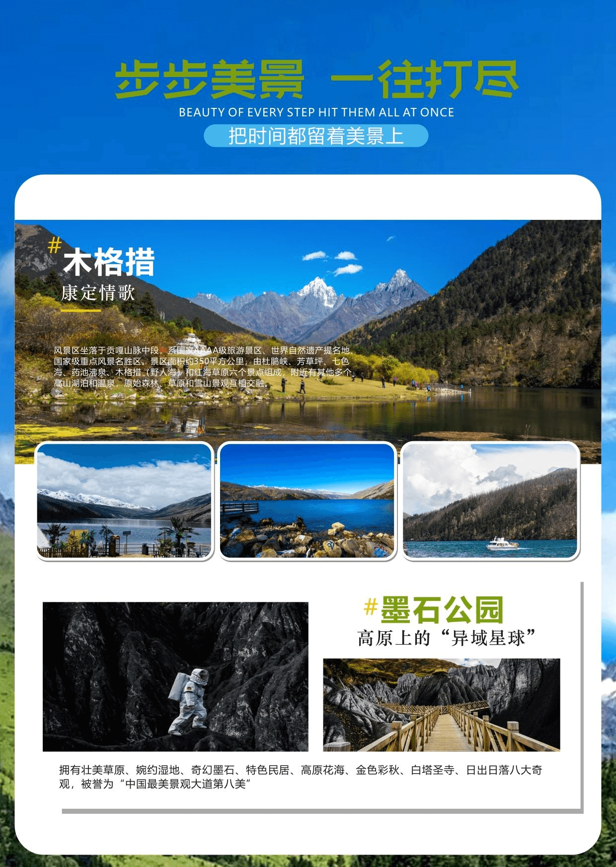 必須消費(fèi):雙橋溝觀光車 70 元、亞丁景區(qū)觀光車 120 元、木格措觀光車 90 元、墨石觀光車 20 元。