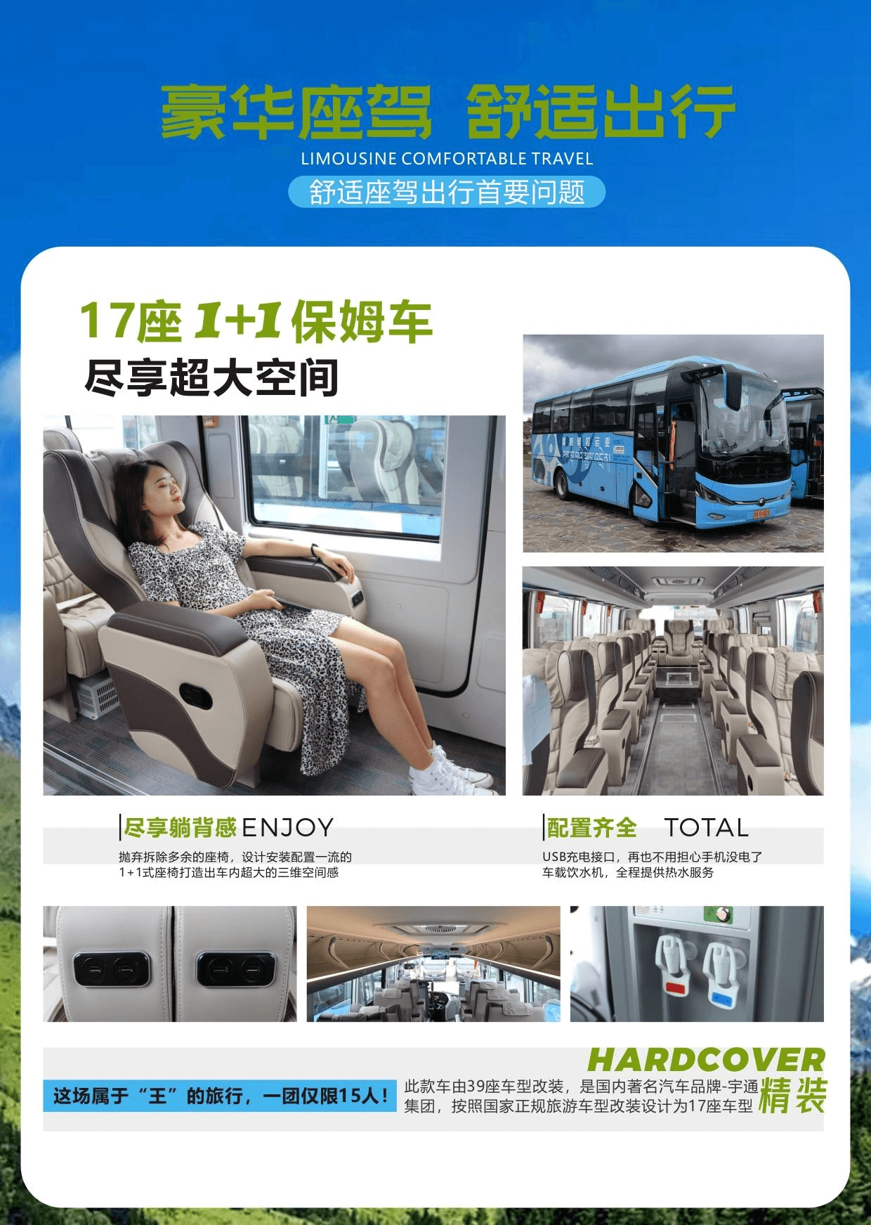 交通:1+1 陸地頭等艙保姆車;關(guān)于保姆車溫馨提示:保姆車型由于按照國家車輛安全規(guī)定的要求設(shè)計(jì),車輛的最后一排座椅為 2+1 布局以及無法座椅后仰、安全門的座椅無法調(diào)整座椅后仰和無 USB 接口,望游客盡請(qǐng)諒解。8 人(含)以下使用 9 座 1+1 保姆車。