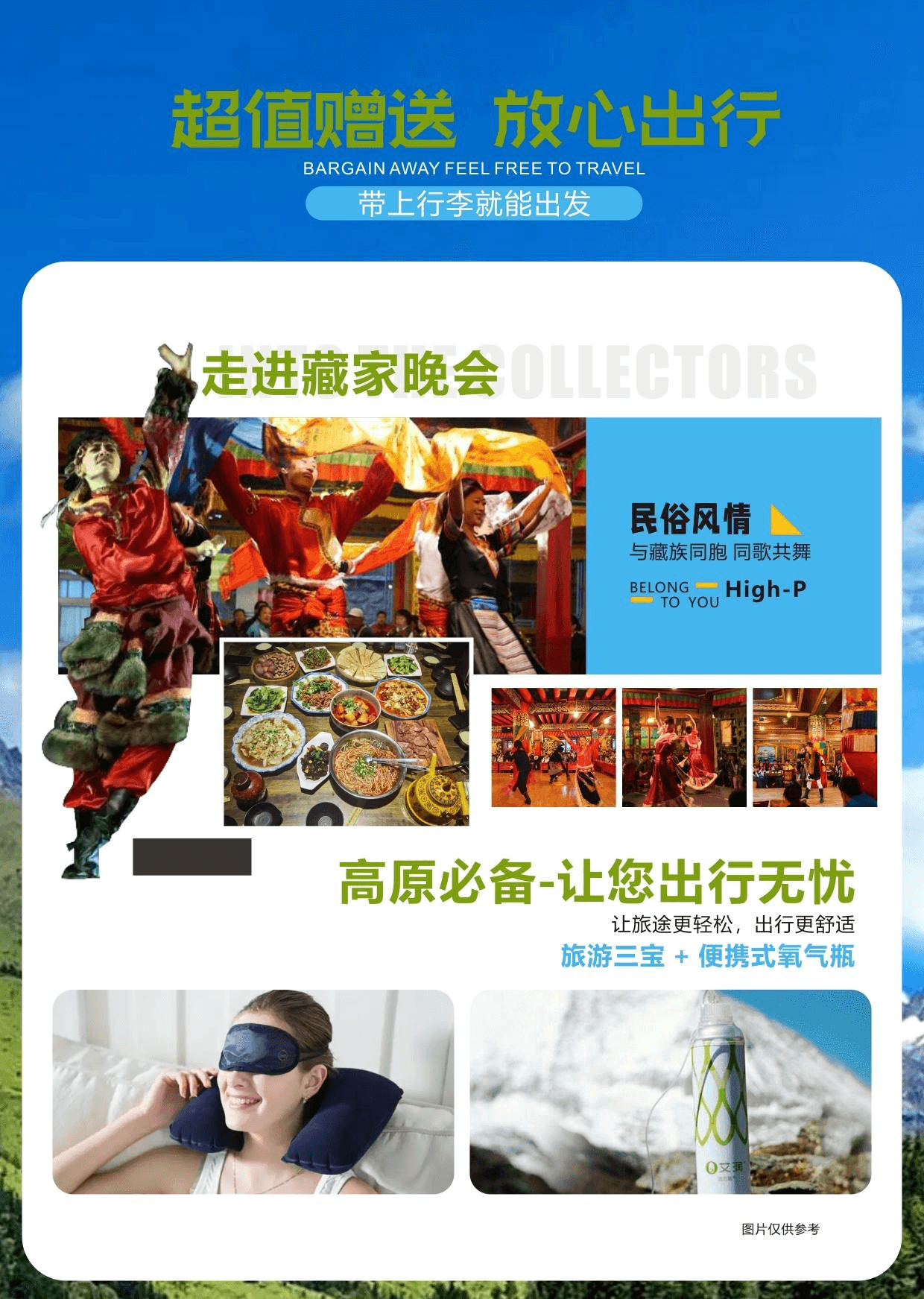 溫馨提示:因當(dāng)天游客出景區(qū)時(shí)間不統(tǒng)一,所以旅游車無法統(tǒng)一接送游客,游客可以選擇乘坐當(dāng)?shù)毓卉嚕?-10 元/人自理)。晚上贈(zèng)送走進(jìn)藏家歌舞晚會(huì)(贈(zèng)送項(xiàng)目,如遇特殊情況無法贈(zèng)送或自愿放棄等,不用不退費(fèi)且不做置換)