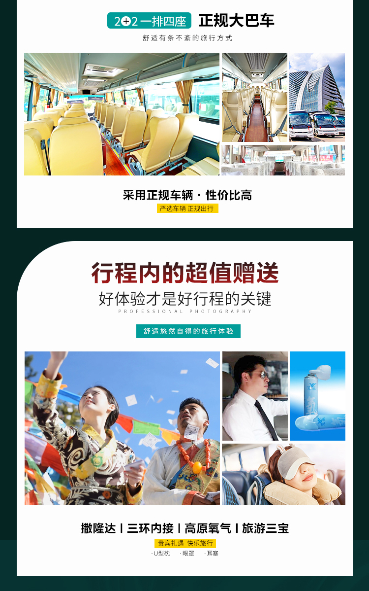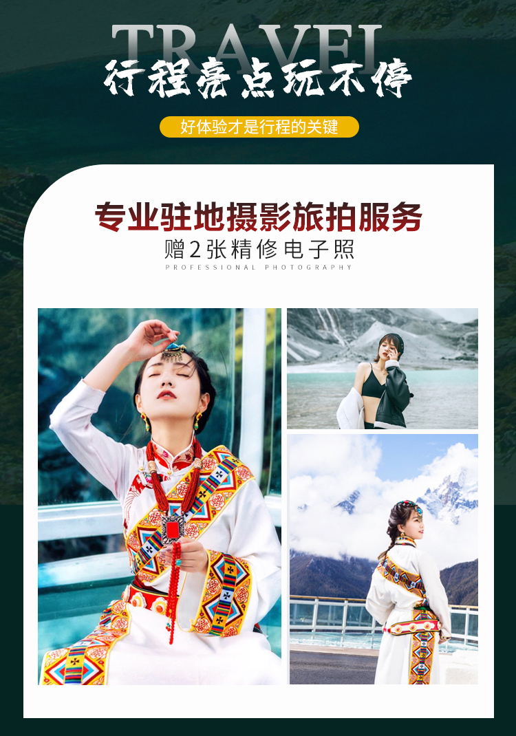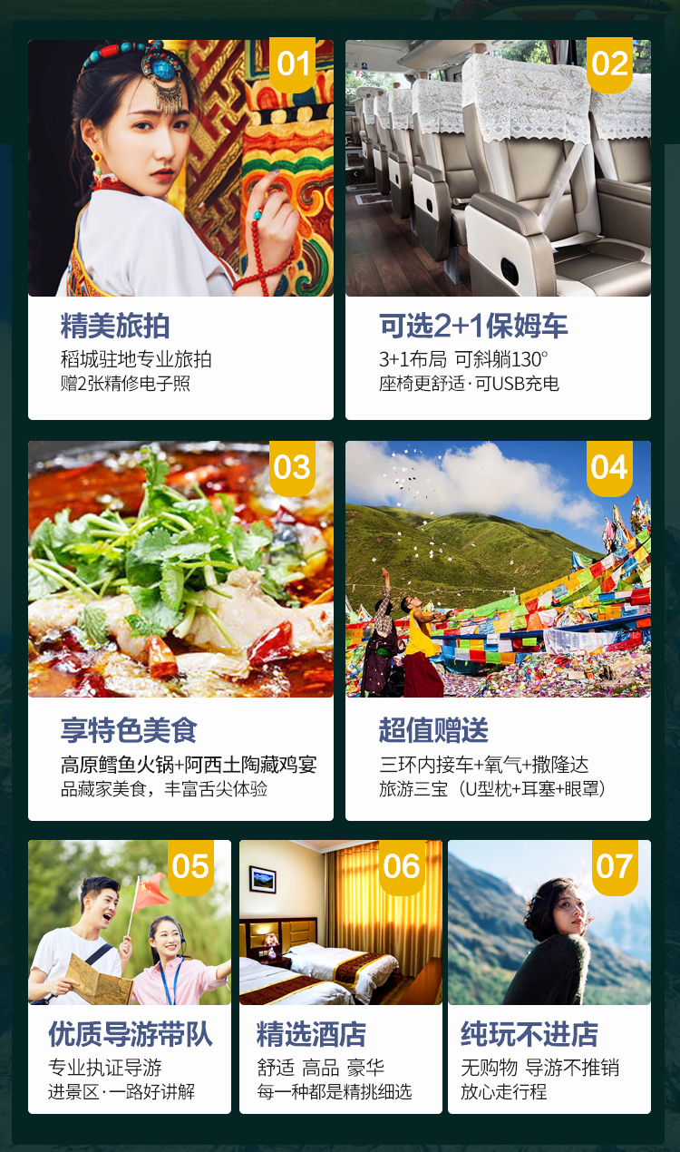 | 贈送 | 1、【貼心贈送】三環內接車服務+贈便攜式氧氣+旅游三寶+贈旅游保險 2、【精美旅拍】贈精美旅拍(專業駐地攝影旅拍服務,免費使用旅拍道具+送精修電子照2張); 3、【全程用車】正規空調旅游大巴,免費升級2+1頭等艙保姆車,真皮座椅可斜躺、USB充電; 4、【特色美食】品嘗理塘高原鱈魚,阿西土陶藏香雞宴; 5、【網紅推薦】獨家贈送魚子西景點+墨石公園景點(贈送魚子西清潔維護費) 6、【貼心安排】撒隆達祈福活動,祈求好運連連,平安順遂。 |