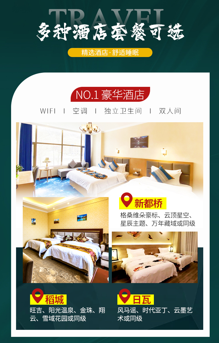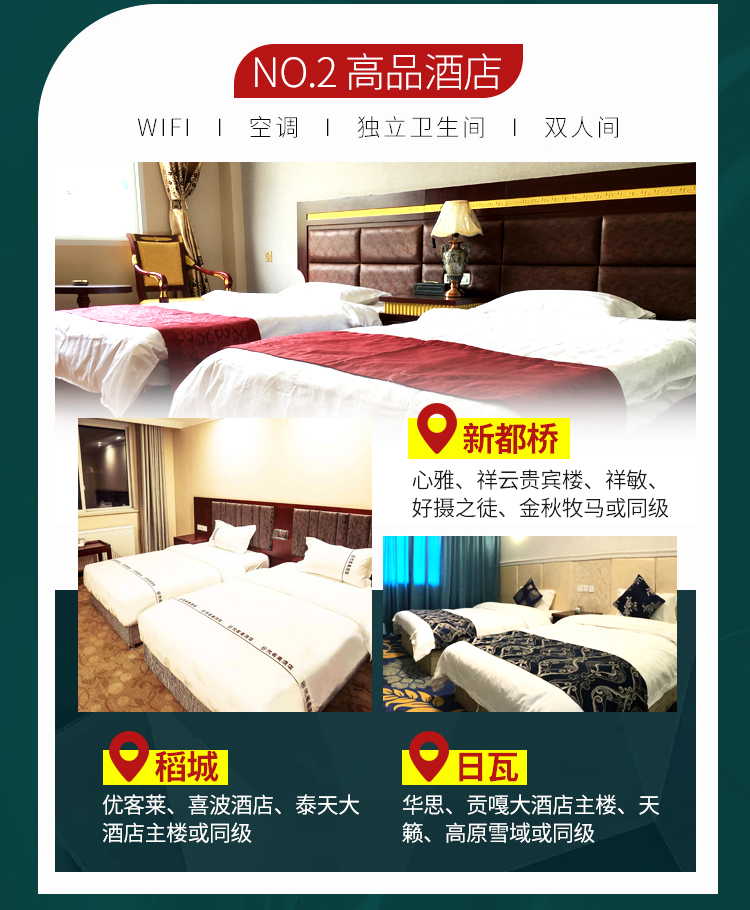 | 住宿 | 1、舒適酒店:花園酒店/祥敏大酒店/雅渝酒店/岷雅莊園/川渝酒店/云觀精品民宿/貢嘎 1 號店/高原雪域假日酒店/達瓦驛站/藏域明珠/人和鑫源/瑪雅拉吉/貢嘎酒店/拼英藏家酒店/達吉客棧、圣地亞丁酒店/恒森飯店/朗喀酒店/忠仁賓館/圣地假日普標或同級 2、溫馨提示:當地住宿硬件和軟件條件有限,多為太陽能熱水器,限時供應熱水;為了環保,請自帶洗漱用品及毛巾;對住宿要求高的客人可自費升級高品/豪華酒店(詳詢客服) |