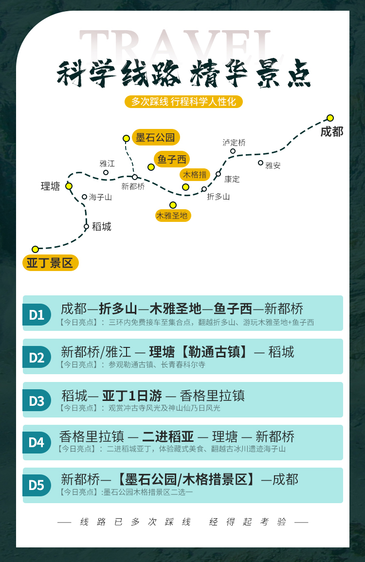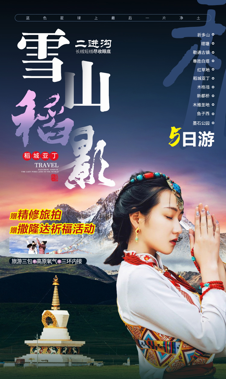 | 門票 | 1、含亞丁景區門票,木雅圣地(贈),魚子西清潔維護費(贈),墨石公園或木格措(贈),勒通古 鎮(贈)(門票為贈送,不退不改) |