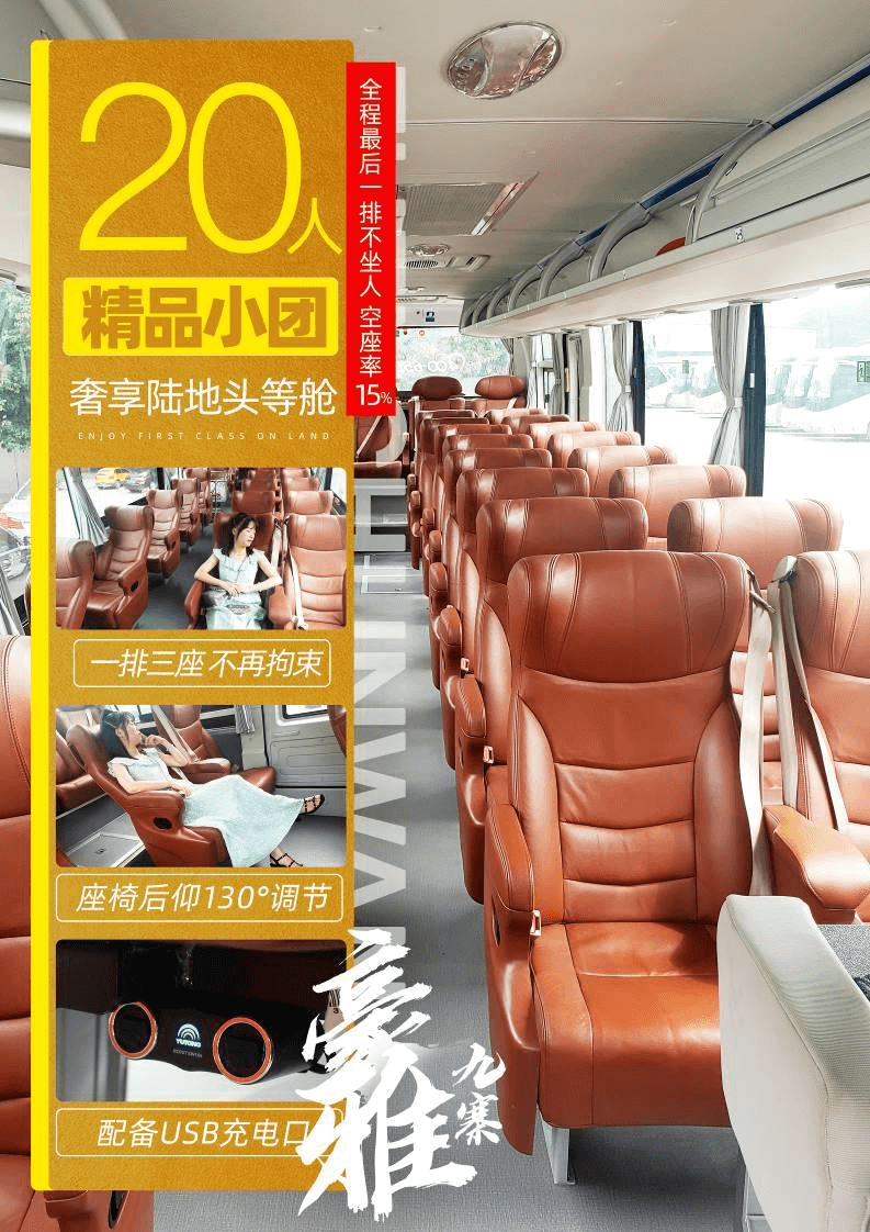 2+1 頭等艙:真皮座椅,獨立安裝+自由調節,每排座位僅 3 座,間距寬大,全車配 USB 充電接口(車型最后一排為 4 座,應急安全門及最后一排座椅無法調整,敬請理解!)